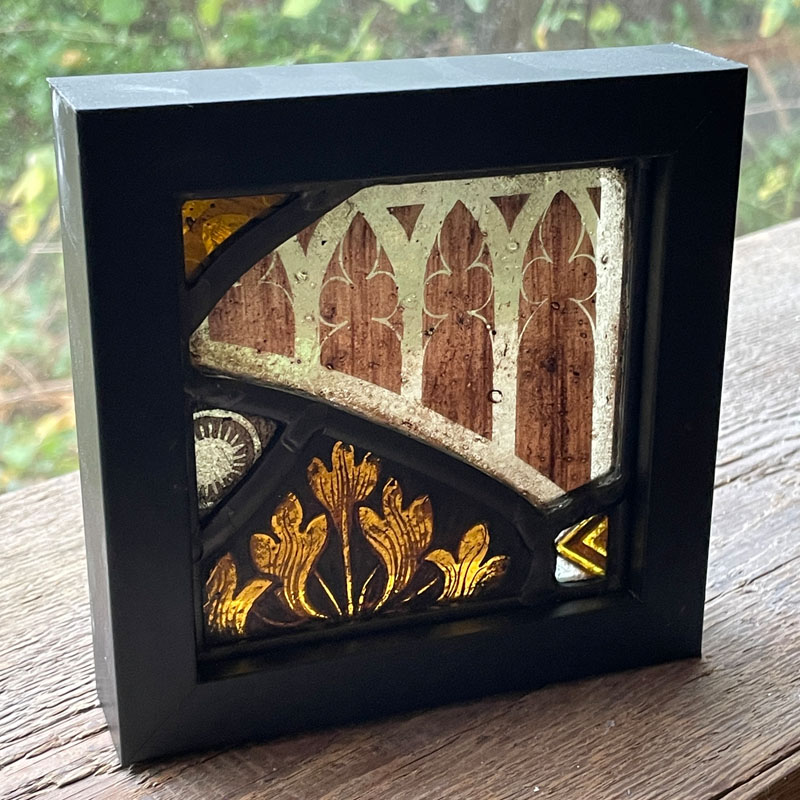 A small framed stained glass panel made with historic glass fragments from Charterhouse School in Godalming. The glass was originally made for the chapel in around 1872 by the London firm of Clayton & Bell. It has survived two fires and has been reinvented into a new work of art in my studio in Farncombe.