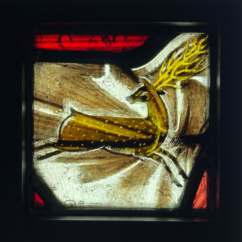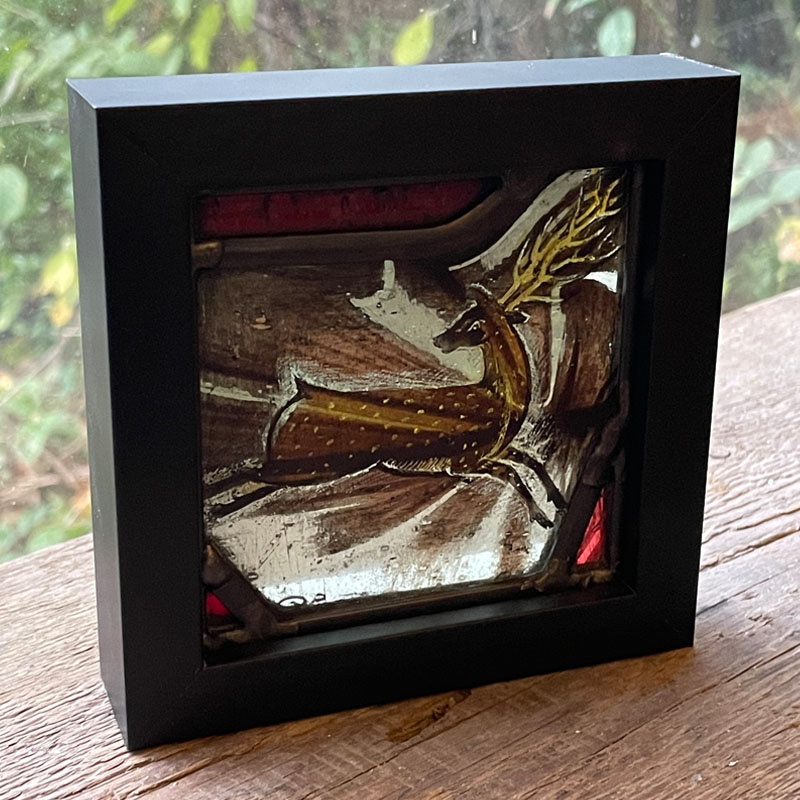 I adapted an image of a leaping deer for this small panel. I selected a piece of painted drapery and engraved then painted the deer. The glass was fired with yellow silver stain on the back in one firing. It is a mix of old and new with the folds of cloth still visible behind the leaping deer.