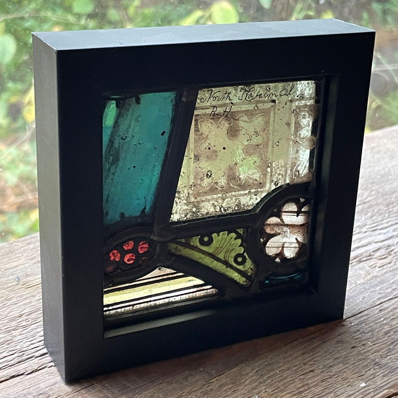 A small framed stained glass panel made with historic glass fragments from Charterhouse School in Godalming. The glass was originally made for the chapel in around 1872 by the London firm of Clayton & Bell. It has survived two fires and has been reinvented into a new work of art in my studio in Farncombe.
