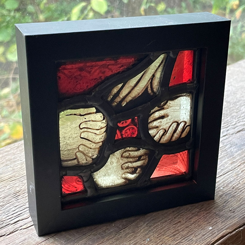A small framed stained glass panel made with historic glass fragments from Charterhouse School in Godalming. The glass was originally made for the chapel in around 1872 by the London firm of Clayton & Bell. It has survived two fires and has been reinvented into a new work of art in my studio in Farncombe.