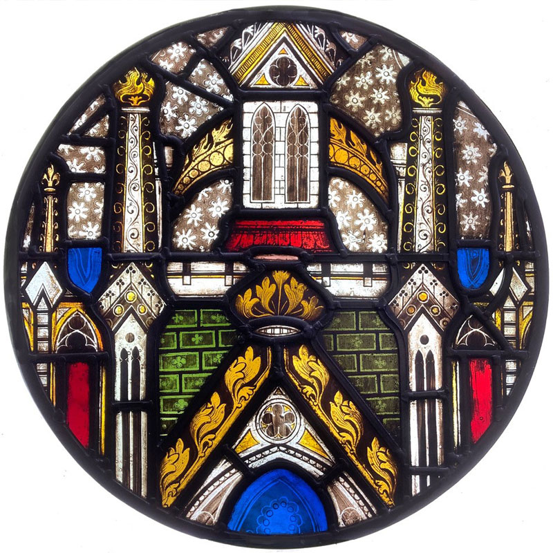 There were many panels from the top of the windows that had decorative architectural canopies. This was one of the better preserved panels that still has symmetry. It would have been seen from a distance so the background glass painting is quite crude in places. I like to think it was done by an apprentice learning their skills.