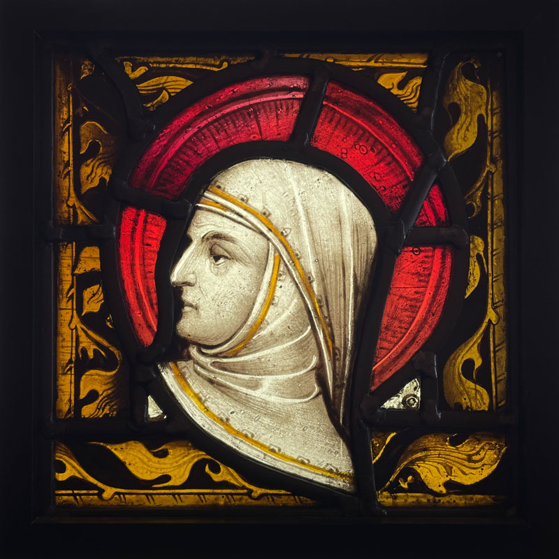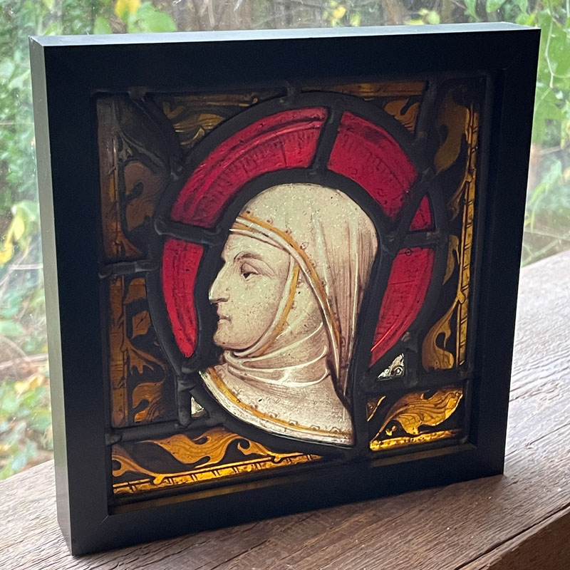 The painted head of a woman somehow survived a fire that destroyed most of the panel. Here it is set in a rich amber border to compliment the red glowing halo.