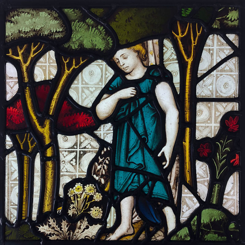 An unframed stained glass panel made with historic glass fragments from Charterhouse School in Godalming. The glass was originally made for the chapel in around 1872 by the London firm of Clayton & Bell. It has survived two fires and has been reinvented into a new work of art in my studio in Farncombe.